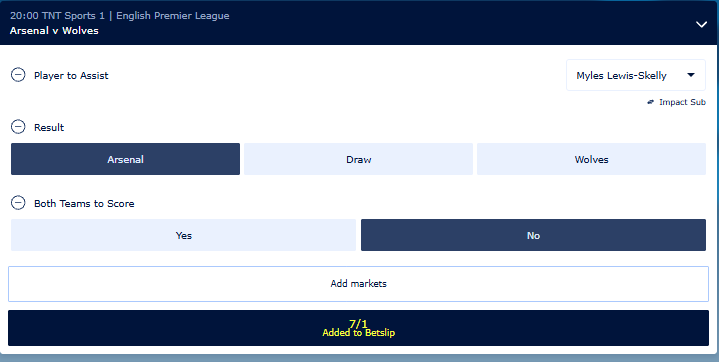 7/1 Bet Builder and keep your player-based bets alive until the final whistle with Impact Sub.