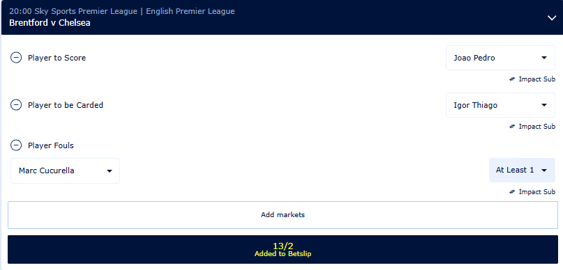 13/2 Bet Builder and keep your player-based bets alive until the final whistle with Impact Sub.