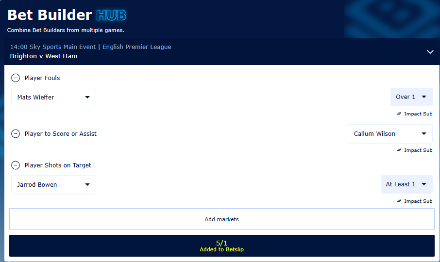 5/1 Bet Builder and keep your player-based bets alive until the final whistle with Impact Sub.